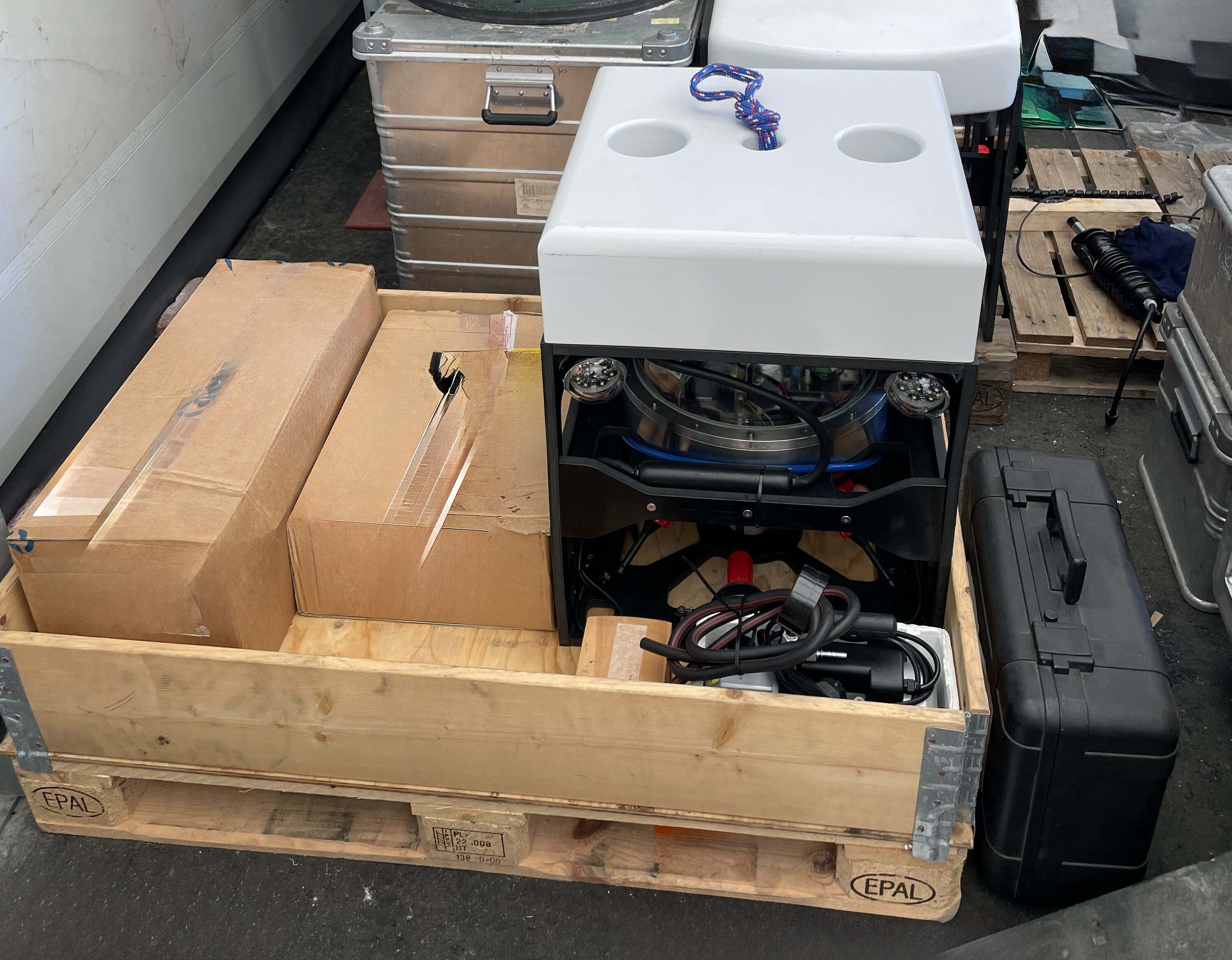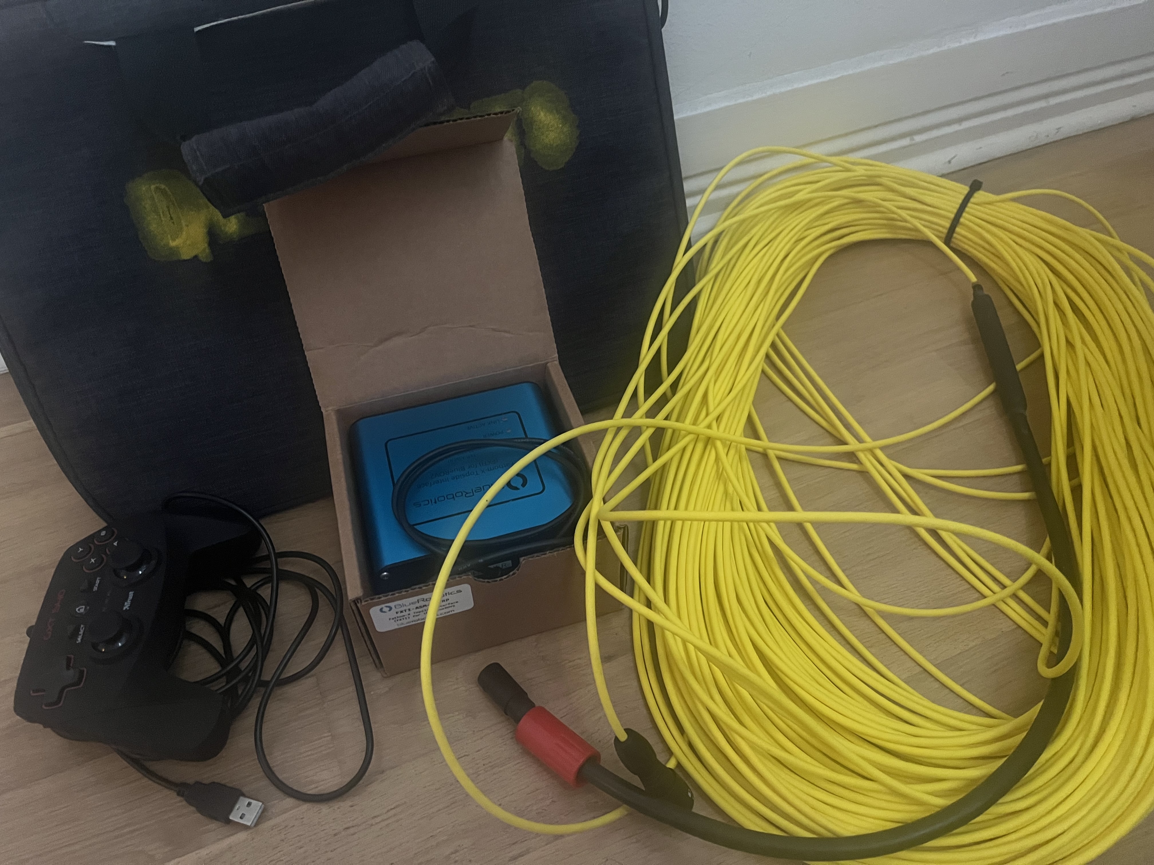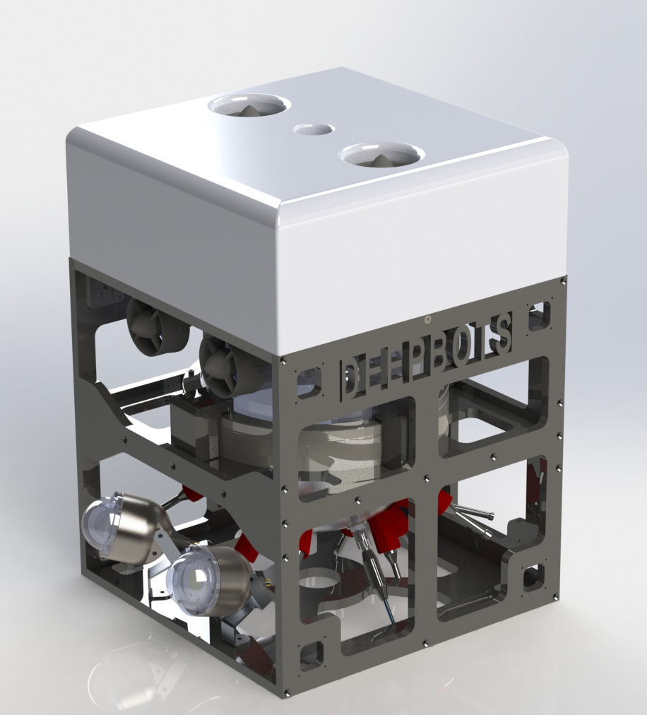 Battery powered compact 6000m rated ROV mainly built with Blue Robotics electronics and components such as battery, camera, thrusters, etc. System comes with short length of umbilical.