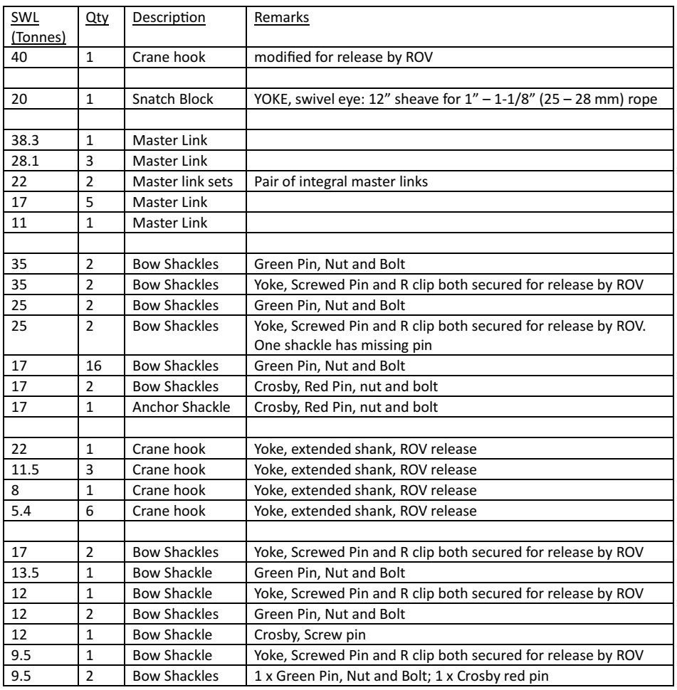 Back to results Rigging Equipment Item Reference: MIS-542 Add to enquiry list Remove from enquiry list Mixture of shackles, crane hooks, master links and 1 x snatch block. Manufacturer Various Enquire about this item Submit your details and a member of our team will be in touch with further information. First name Last name Email Phone number Message (optional) I agree to Specialist Underwater Brokerage processing my personal data in accordance with their Privacy Policy Send Enquiry Get our lists straight to your inboxStay informed with a monthly round-up of available ROV and Survey equipment. No spam – just one issue of both DEEPSEARCH and SURVEYSEARCH each month. Subscribe