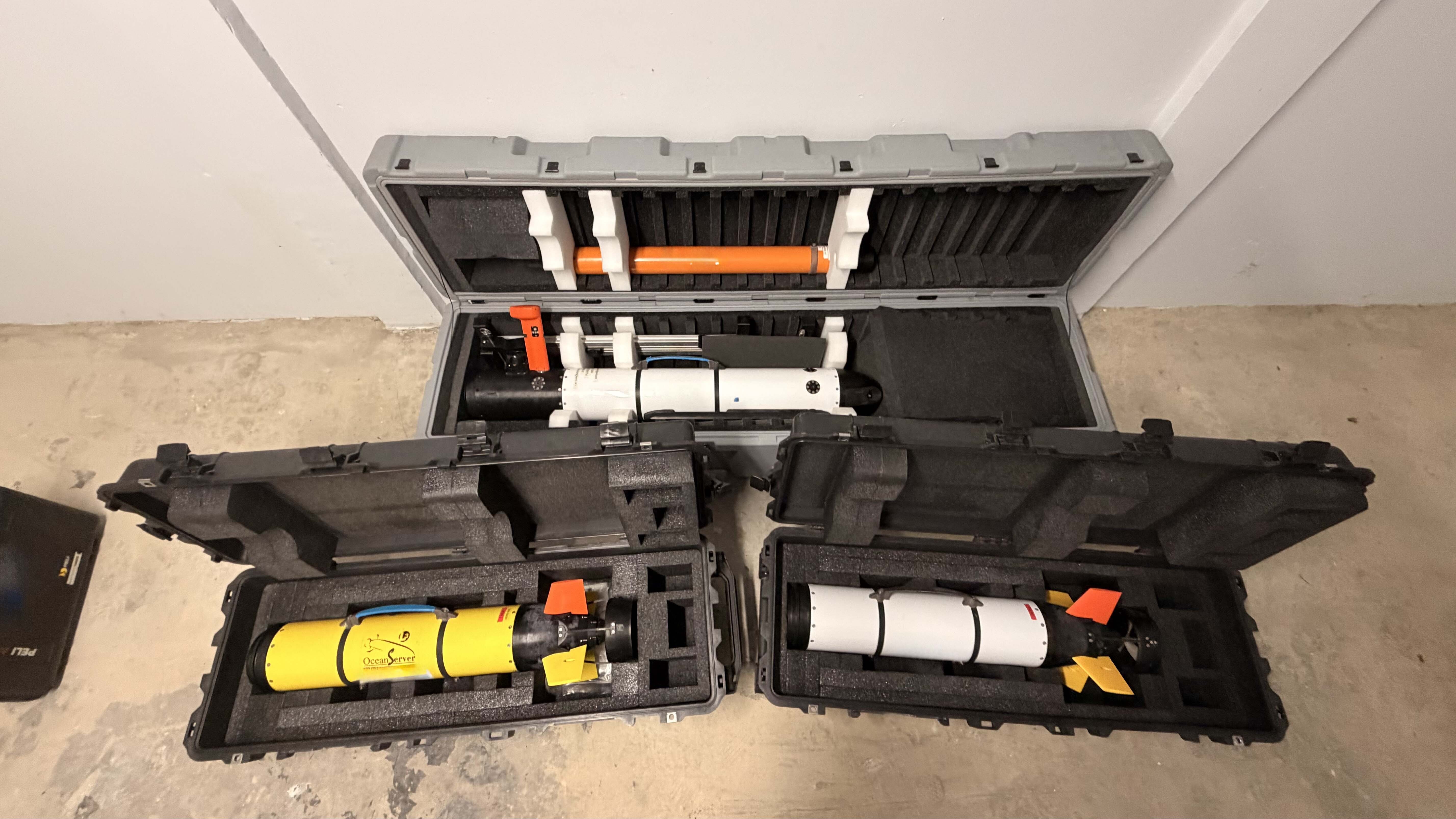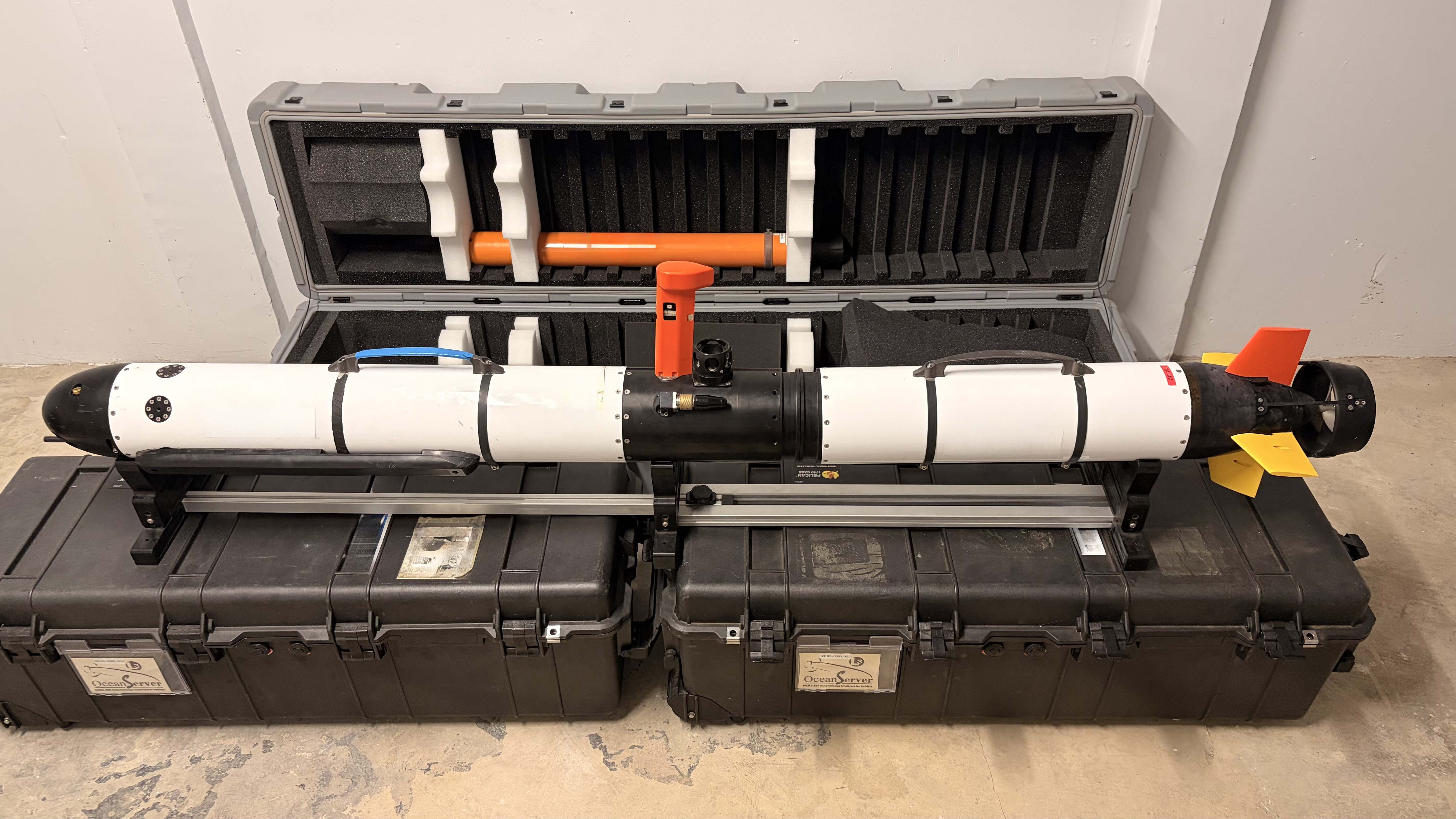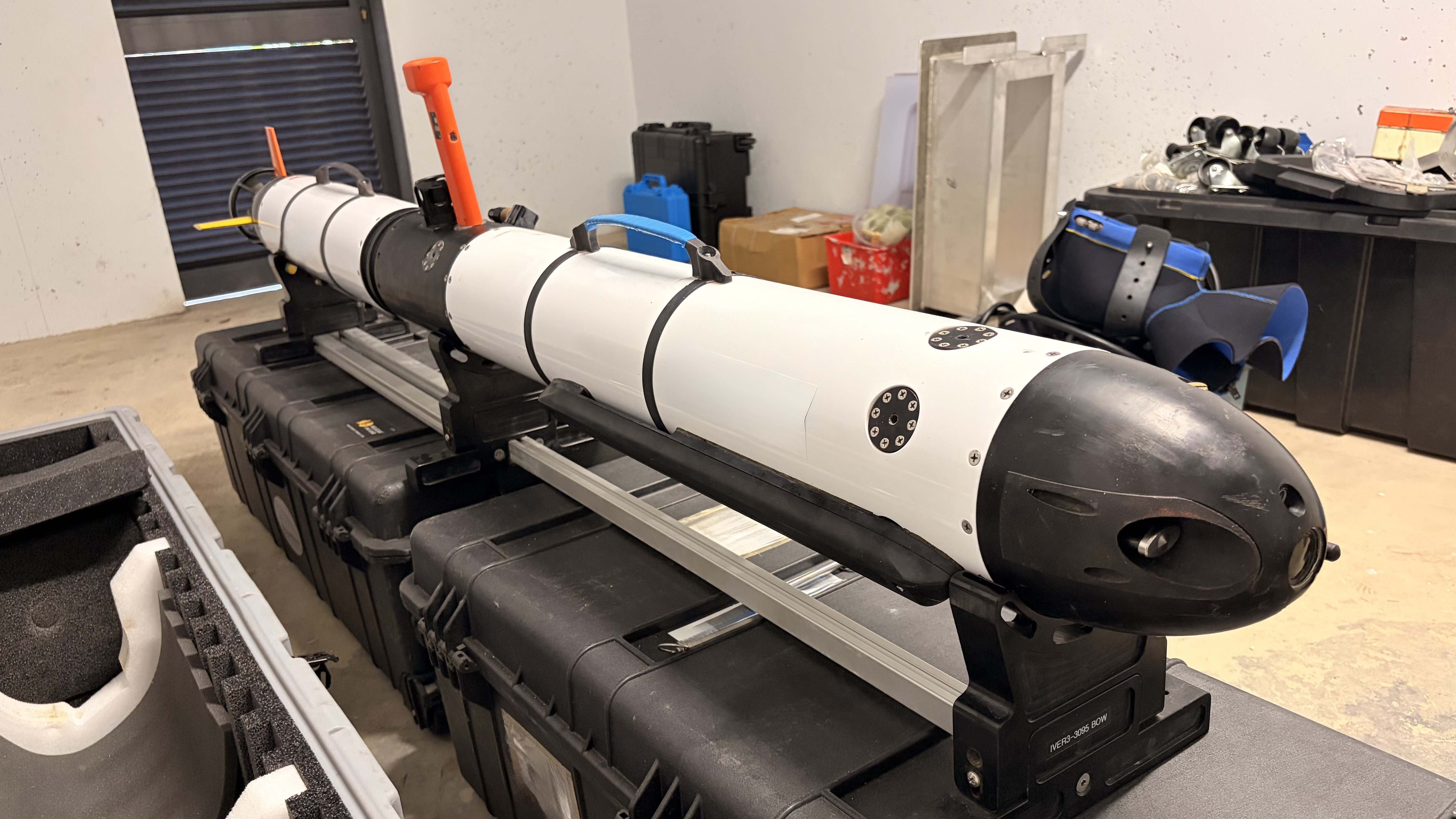 Complete high resolution autonomous underwater vehicle. AUV is fitted with a Edgetech Sidescan Sonar (600 / 1600 kHz), Marine Magnets magnetometer and RDI DVL + ADCP.